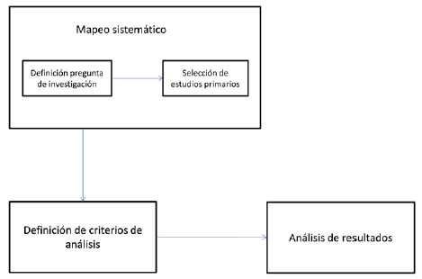 Con esto, la metodología seguida en el estudio contempla: el mapeo sistemático,donde se obtienen los estudios primarios; la definición de los criterios de análisis, es decir, el esquema de caracterización; y el análisis de resultados. La Figura 1 grafica esta metodología que es una adaptación y simplificación del procedimiento presentado en [11].