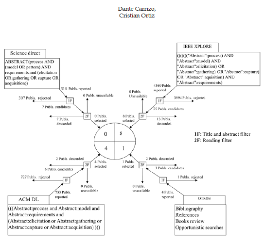 Para conformar la cadena de búsqueda en las bases de datos de publicaciones se tuvo en cuenta el foco central de la investigación que eran los modelos de procesos de educción de requisitos. En el caso de la palabra clave "educción" se seleccionaron, además de elicitation, conceptos normalmente utilizados en el área de investigación, tales como: gathering, capture o acquisition. Así, la cadena final fue la siguiente:
