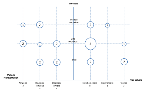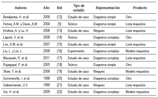 La Tabla 1 ilustra también cuál método de representación gráfica utiliza cada trabajo para esquematizar su propuesta. Se clasifica esta característica en: "diagramas simple", cuando la propuesta utiliza un diagrama sencillo para esquematizar de forma general el proceso, por ejemplo un diagrama de flujo o conceptual, pero sin mayor detalle; "diagrama complejo", si la propuesta muestra un diagrama más completo para la representación, que entrega más detalles del proceso o incluye múltiples vistas de él, como un diagrama bpmn, uml o un grafo; y "ninguna", si la propuesta no incluye ningún tipo de representación. En este aspecto nuevamente hay variedad de esquemas, por ejemplo, se utilizan diagramas de flujo sencillos, o esquemas propios con propósitos meramente ilustrativos o conceptuales y no de representación completa de la propuesta, es decir, diagramas simples. También hay propuestas que no utilizan ninguna representación, limitándose a describirla. Por otro lado, hay estudios que representan de forma más completa sus propuestas como el caso de [17], donde hacen uso extensivo de la notación bpmn, utilizándola para representar toda la propuesta de educción. También en [20] incluyen primero un diagrama en espiral del proceso de requisitos y luego otro esquema más detallado para el proceso de extracción de los Viewpoints que está incluido en el anterior. En [22] presentan el esquema del grafo del modelo actor-dependencia que representa todo el proceso optimizado de toma de decisiones de la propuesta.