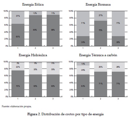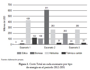 Para el segundo escenario, la energía hidráulica permanece como una fuente energética importante, por lo que tiene un costo significativo. En los resultados se puede observar (figura 1) que el costo total de la biomasa es el más elevado por el gran peso del costo fijo con respecto a las demás energías; seguida por la energía hidráulica nuevamente por su alta capacidad acumulada.