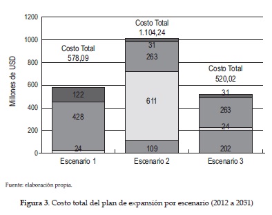 En la figura 3 se presenta la información del costo total de los tres escenarios propuestos de cada plan de expansión teniendo en cuenta todas las variables analizadas anteriormente.