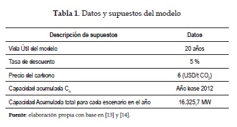 Las tablas 1, 2 y 3 presentan los datos y supuestos de energías renovables usados en el planteamiento del modelo de Costo Total. Debido a la dificultad de hallar datos disponibles para Colombia se usaron datos internacionales que se ajustaran a las condiciones del país y permitieran obtener resultados preliminares, los cuales originan conclusiones y recomendaciones para ajustar la matriz de generación energética en el país.