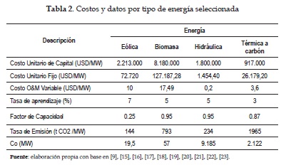 De acuerdo con la información del modelo, suministrada en la metodología de este artículo, se realizó el análisis de Costo Total, ecuación (6), para cada una de las energías propuestas: eólica, biomasa, hidráulica y térmica a carbón, considerando la experiencia obtenida en el tiempo, es decir, aplicando el concepto de Curva de Aprendizaje.