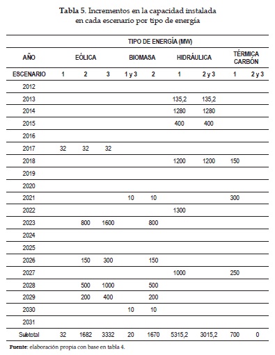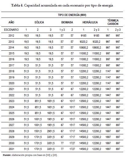 Como se mencionó en la tabla 1, la capacidad acumulada de las cuatro energías al final de los 20 años (desde 2012 hasta 2031) será de 16.325,7 MW para los tres escenarios, esto con el fin de que cualquiera supla la misma demanda.