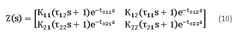 La matriz Z(s) surge de la acción de transformar la matriz de función de transferencia del proceso G(s) en una aproximación diagonal G'(s), por lo que cada lazo se puede analizar de forma independiente. Una aproximación válida para los términos del tiempo muerto en Z(s) es la expansión por serie de Taylor de primer orden [14]: