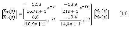 Donde XT(s) y XF(s) representan el porcentaje de las concentraciones de producto de tope y fondo de la columna de destilación, además, M1(s) y M2(s) son los flujos manipulados para controlar la concentración de los productos de la columna.