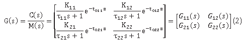 El diseño de desacopladores tradicionalmente se basa en modelos que describen la respuesta transitoria y permanente del sistema multivariable. La matriz de función de transferencia de un proceso multivariable 2x2 para un modelo de primer orden más tiempo muerto (POMTM) puede ser descrita de la siguiente forma: