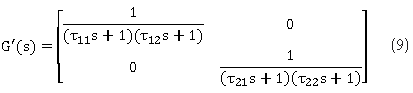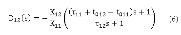 Donde K representa las ganancias estáticas, Tij las constantes de tiempo y t0ij el tiempo muerto. Usando la ecuación (1) se calcula el bloque D(s) tal que: