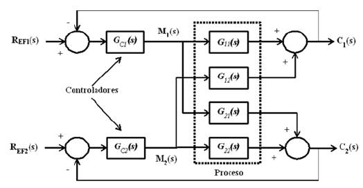 La Fig. 1 muestra el esquema clásico de control multivariable para un sistema de dos entradas y dos salidas (2x2). La interacción entre los lazos de control se representa por las funciones de transferencia G12(s) y G21(s). Los controladores GC1(s) y GC2(s) actúan sobre los lazos directos de control modelados por las funciones de transferencia G11(s) y G22(s). Un cambio en los valores de referencia del sistema de control multivariable REF1(s) y REF2(s) afecta la estabilidad y desempeño de los lazos de control.