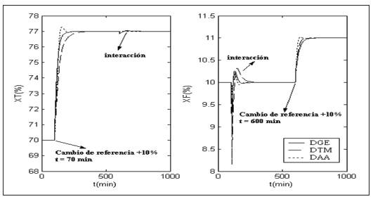 La Fig. 10 muestra el desempeño de un esquema de control PID junto con las técnicas de desacoplamiento para cambios de +10% en el valor de referencia, en t=100 min y t=600 min para XT y XF respectivamente.