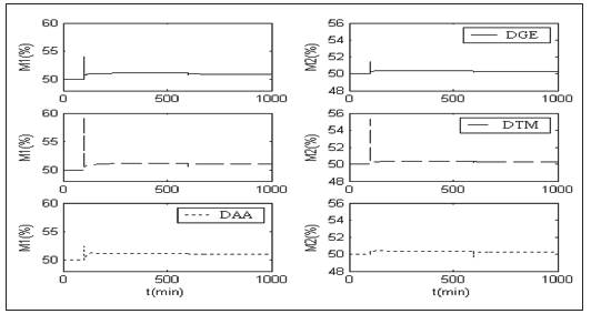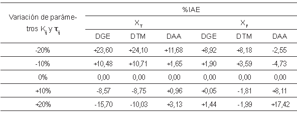 La Tabla 5 muestra el desempeño del sistema de control mulivariable en función del porcentaje de variación del IAE para cambios del punto de operación (ver Fig. 10) y errores de modelaje en los parámetros . Se observa como el sistema de controljunto con la técnica DAA presenta menores variaciones del IAE, mejorando el rendimiento del sistema de control. Para este caso el rendimiento más pobre se muestra con desacopladores DTM.