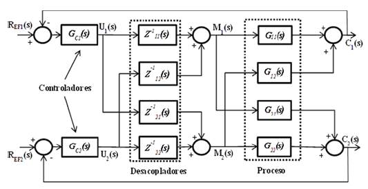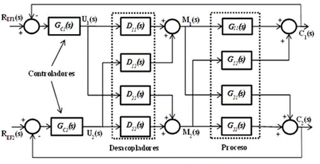 Eliminar la interacción entre las variables controladas puede hacerse mediante el uso de un bloque desacoplador. Los desacopladores descomponen el sistema multivariable en múltiples subsistemas de una variable, permitiendo establecer un sistema de control multivariable con controladores independientes para cada lazo de control [12].