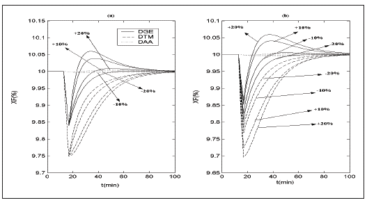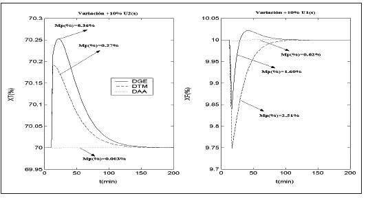 La Fig. 7 muestra el desempeño de las técnicas de desacoplamiento en la salida XT para errores de modelaje en las constantes de tiempo (xn y t12). Se observa como ambas técnicas rechazan el efecto de la interacción, sin embargo, el uso de DGE y DTM aumenta la magnitud de Mp(%) y Ts teniendo un mejor desempeño los DAA. La Fig. 8 muestra un comportamiento similar en la salida XF para errores de modelaje en las constantes de tiempo (t21 y t22).