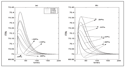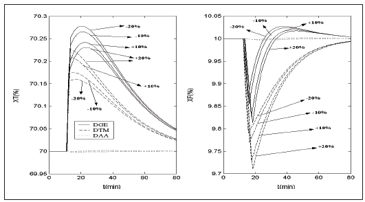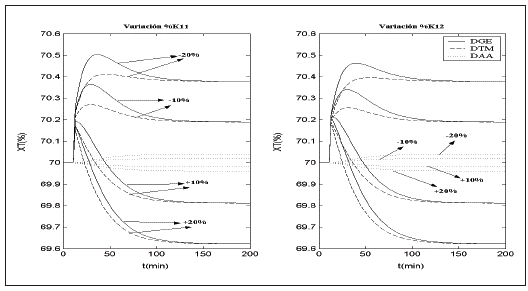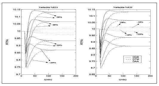 La Fig. 5 muestra la respuesta de XT para variaciones en las ganancias estáticas (K11 y K12) en un rango de ± 20%. De manera similar la Fig. 6 muestra la salida XF para variaciones en las ganancias estáticas (K21 y K22) en el mismo rango. Para ambos casos se observa que los desacopladores pierden su funcionalidad, por lo que errores de modelaje en estos parámetros comprometen el rendimiento de las técnicas de desacoplamiento. Sin embargo, el uso de DAA desvía en menor magnitud la salida del punto de operación, por lo que el uso de esta técnica junto con estrategias de control puede mejorar el rendimiento global del sistema.