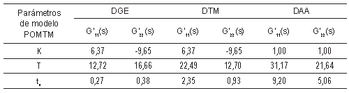 La Tabla 2 muestra los parámetros del modelo POMTM del sistema diagonal G'(s) usando el método de la curva de reacción, mostrando ganancia estática (K), constante de tiempo (t) y tiempo muerto (t0) [12].