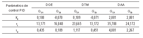 La Tabla 3 muestra los valores para los parámetros de sintonización de controladores PID usando las ecuaciones de Dhalin para la ganancia proporcional (KP), constante de tiempo integral (tí) y constante de tiempo derivativa (rd) [17]. En este caso GC1 representa el controlador para el lazo directo G'11(s), y GC2 el controlador para el lazo directo G'22(s).