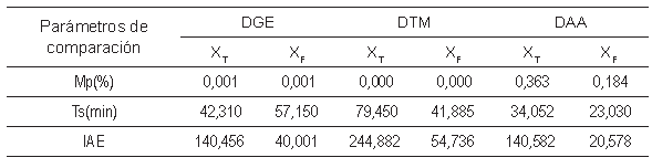 El uso de controladores PID junto con DAA mejora el desempeño del sistema de control en términos del IAE y Ts, ya que la técnica de desacoplamiento considera mayor información de la dinámica del proceso. Por otro lado, el uso de DGE y DTM reducen el Mp(%) en las variables controladas XT y XF.
