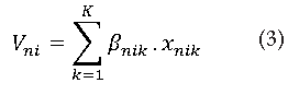 Donde la utilidad observable o determinística (Vni) estará en función de una serie de atributos medibles tanto de las alternativas como del elector, denominados , tal como se describe en la Ecuación 3, la cual comúnmente se expresa lineal en los parámetros.