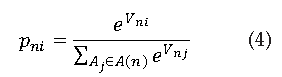 Los modelos desarrollados con este enfoque son aproximaciones probabilísticas, entre los cuales se destaca el Modelo Logit Multinomial (MNL), bajo el supuesto de que los términos de error siguen una distribución idéntica e independiente Gumbel, con media cero y varianza [4]. Así, la probabilidad de que el individuo n escoja la alternativa i, está dada por: