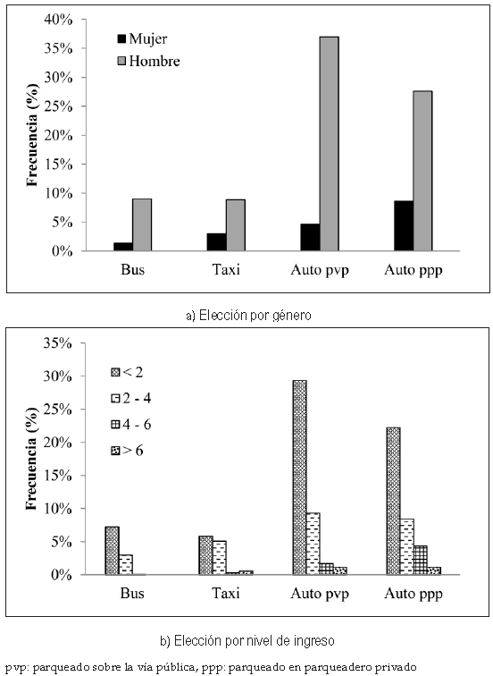 Fue notable una mayor preferencia hacia la utilización del vehículo particular que se parqueó sobre la vía, tal como se observa en la Fig. 2, que describe la elección por género e ingreso.