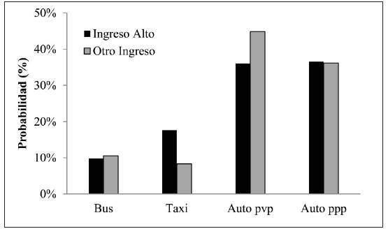 Al aplicar el modelo MNL1 con base en los valores medios de las variables contenidas en las funciones de utilidad (ver Fig. 3) se pudo evidenciar que, para viajes al centro de la ciudad de Montería, el modo bus posee aproximadamente la misma probabilidad (10,5%) de ser utilizado tanto por individuos de ingreso alto como de otro tipo de ingreso.