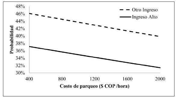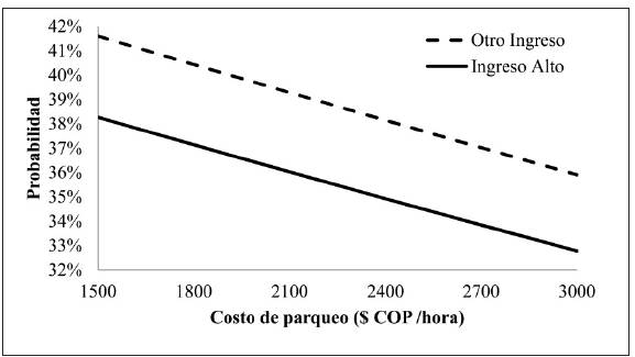 Los resultados también muestran que existe un 9% más de probabilidad de que los individuos de ingreso alto utilicen el taxi para sus viajes al centro de la ciudad. En esa misma proporción es más probable que los individuos con ingreso bajo parqueen sobre la vía respecto a los individuos de ingreso alto, lo cual corresponde con los comportamientos esperados de la teoría microeconómica de la utilidad aleatoria.