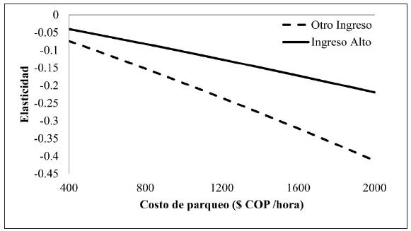 Los resultados encontrados muestran que la elasticidad para los usuarios de menor ingreso es casi el doble que para los usuarios de alto ingreso, lo cual es un indicativo de que una política restrictiva de gestión de precios de parqueo afectaría más a grupos con menores ingresos [18]. En las Figs. 6 y 7 se muestran las elasticidades para diferentes niveles de costo, en las dos situaciones de parqueo estudiadas.