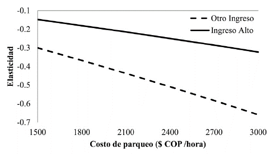 La elasticidad entre la tarifa y la demanda de parqueo de vehículos particulares sobre la vía, calculada con base en los valores medios, dieron valores de -0,07 y -0,13 para usuarios de ingreso alto y con otro tipo de ingreso respectivamente, mientras que para el parqueo de vehículos particulares en parqueadero privado, las elasticidades fueron de -0,20 para individuos de ingreso alto y de -0,44 para usuarios con otro tipo de ingreso. Estos valores se consideran razonables si se comparan con estándares internacionales que ubican este tipo de elasticidades entre -0,1 y -0,3 [8], [14]-[17].
