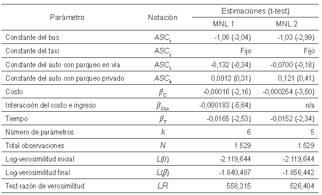 Después de probar varias especificaciones, se decidió modelar el atributo tiempo como la suma del tiempo de viaje más el tiempo de acceso. Las alternativas fueron identificadas así: 1-Bus, 2-Taxi, 3-Vehículo particular parqueado sobre la vía y 4-Vehículo particular estacionado en parqueadero privado. Fueron considerados dos modelos distintos tal como se indica.