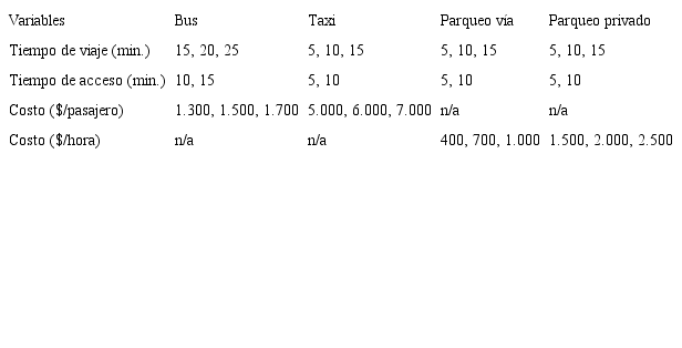 El experimento consideró cuatro alternativas para viajar al centro de la ciudad: bus, taxi, auto particular parqueando sobre la vía y auto particular estacionando en parqueadero privado. Para cada una de ellas se definieron tres atributos principales: tiempo de viaje, tiempo de acceso y costo. La Tabla 1 muestra el diseño definitivo del experimento con los niveles y valores de las variables utilizadas.
