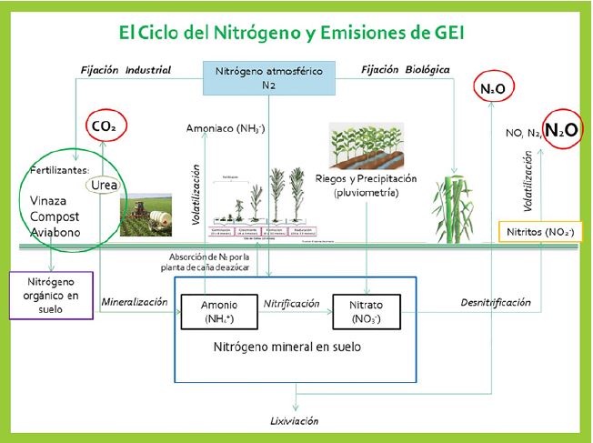 Por otra parte, se sugiere no solo tener en cuenta el ciclo del nitrógeno para evaluar el nivel de emisiones de GEI que generan los suelos gestionados, sino también evaluar cuantitativamente el nivel de aprovechamiento del n por parte del cultivo según estrategias de fertilización previamente recomendadas. Asimismo, la contaminación ambiental que genera el proceso de lixiviación de nutrientes, la degradación del suelo y la afectación a la productividad del cultivo, en razón a una mayor compactación del suelo por el uso de labranzas convencionales y la renovación no constante, evidenciada en algunos contextos en los que los ingenios de producción netamente orgánica desean acumular un nivel de residuos en suelo que queda después de la cosecha, lo cual también es susceptible de evaluación a nivel de emisiones de GEI.
