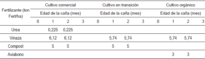 No obstante, para el presente escenario se puede despreciar el aporte de este tipo de cultivo según las dosis recomendadas, dado que bajo las dosis actuales de fertilización el nivel de emisiones es menor con respecto a los otros dos cultivos; además, es un cultivo en transición que solo recibe vinaza y compost (los fertilizantes que poseen un menor contenido de N), mientras que el cultivo comercial recibe adicionalmente urea, y el orgánico reemplaza el uso de compost por aviabono, el cual posee un mayor contenido de N.