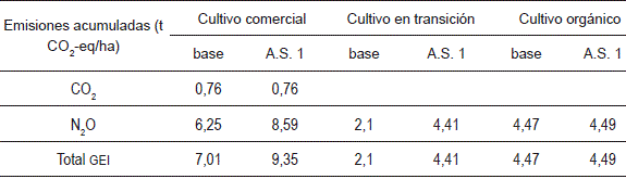 Es necesario mencionar que el cultivo comercial es el único cultivo que no solo recibe fertilización nitrogenada, sino también fertilización ureica o amoniacal, lo cual incrementa las emisiones totales de GEI en un 12 %, medidas en toneladas de CO2 equivalentes, dado que en este caso no solo se produce N2O, sino a su vez co2 por la descomposición de urea en el suelo. Esto hace que a su vez se incrementen las emisiones de GEI totales por parte de este cultivo, medidas en términos de toneladas de CO2 equivalentes.