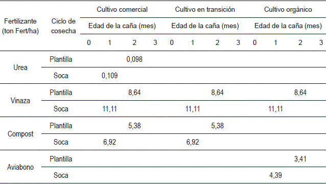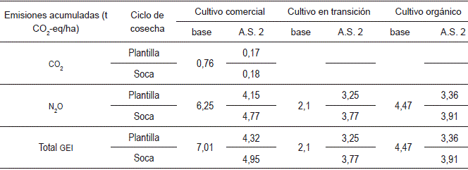 Con respecto al cultivo comercial, al considerar estas dosis recomendadas en el ciclo de cosecha tipo soca se obtiene una reducción en las emisiones del 29,4 %, mientras que en el ciclo tipo plantilla este nivel de reducción alcanza un valor del 38,4 % con respecto a las emisiones obtenidas en la simulación base. En el cultivo orgánico se obtiene una reducción del 12,5 % en las socas, y de 24,8 % en las plantillas, con respecto a las dosis de fertilización actual.