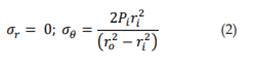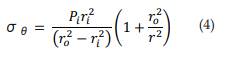 Donde σr: esfuerzo radial; y σθ: esfuerzo tangencial. Al realizar procesos matemáticos se pueden obtener las ecuaciones que describen el comportamiento de los esfuerzos radiales y tangenciales a lo largo del espesor del cilindro (ecuaciones 3 y 4).