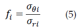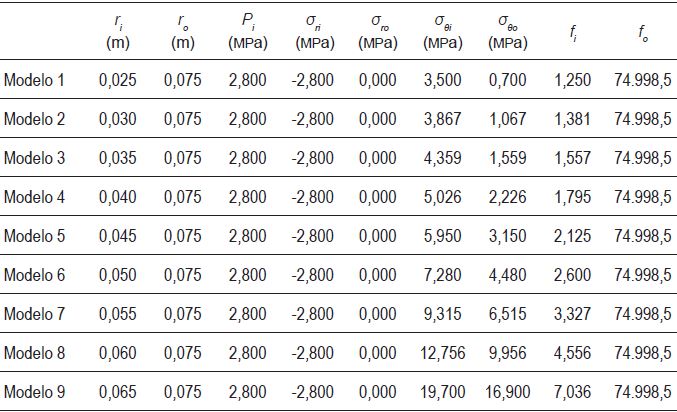Donde σri los valores de σθi y fueron calculados usando las ecuaciones de Lamé (ecuaciones 3 y 4), y donde el valor r de fue tomado como el radio interno de la probeta cilíndrica. Los valores de σro y σθo se calculan para un valor de r igual al radio externo de la probeta. Además, con el fin de establecer la diferencia existente entre los valores del esfuerzo tangencial y el esfuerzo radial se calcularon dos factores fi y fo (ecuaciones 5 y 6).