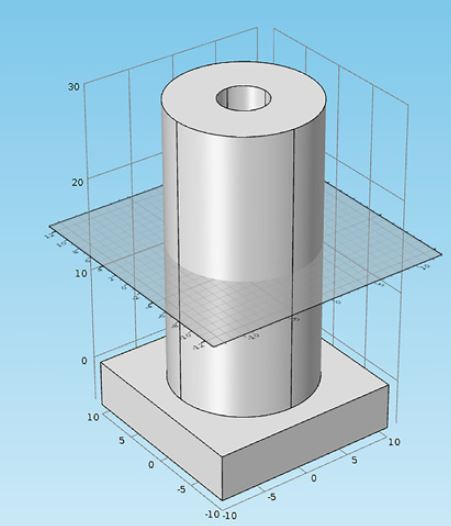 Para este estudio se planteó variar el radio interno del cilindro con el objetivo de determinar el impacto de este parámetro en el valor de los esfuerzos tangenciales y radiales, manteniendo siempre la definición de un cilindro de paredes gruesas [18] (t > r/10 = 0,75 cm [0,30 in], donde es el espesor del cilindro y r es el radio externo del cilindro). Comsol permite establecer un plano de trabajo (working plane) a través del cual se extraen los valores de esfuerzos requeridos en cada una de las caras del cilindro. Los esfuerzos se evalúan a la altura media de la probeta a fin de descartar el efecto de condiciones de contorno en los extremos superior e inferior (Fig. 4).