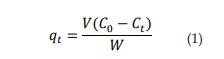 La cantidad de colorante adsorbido en cualquier tiempo t, qt (mg/g), se calculó por medio de la relación de balance de masa [11]: