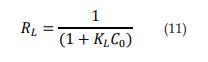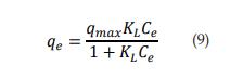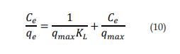 Donde KL es la constante de adsorción de Langmuir (l/mg), qe la cantidad de adsorción en el equilibrio (mg/g), y qmax es la capacidad de adsorción máxima teórica (mg/g). Una gráfica de Ce /qe contra Ce arroja los valores de 1/qmax (intercepto) y 1/qmax KL (pendiente). KL es una herramienta importante para el cálculo del parámetro de equilibrio adimensional que explica la favorabilidad del proceso de adsorción y se calcula según la ecuación 11 [3].