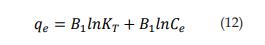 Donde B1 es una constante relativa al calor de adsorción y está definida por la expresión B1 = RT/b, con b la constante de Temkin (j/mol), T en Kelvin y R = 8,314J/molk; y KT es la constante de enlace en el equilibrio o constante térmica de Temkin (l/g). De una gráfica de qe contra lnCe se pueden calcular B1 (pendiente) y KT (el intercepto es B1 lnKT).