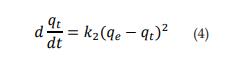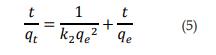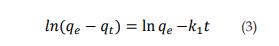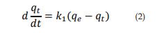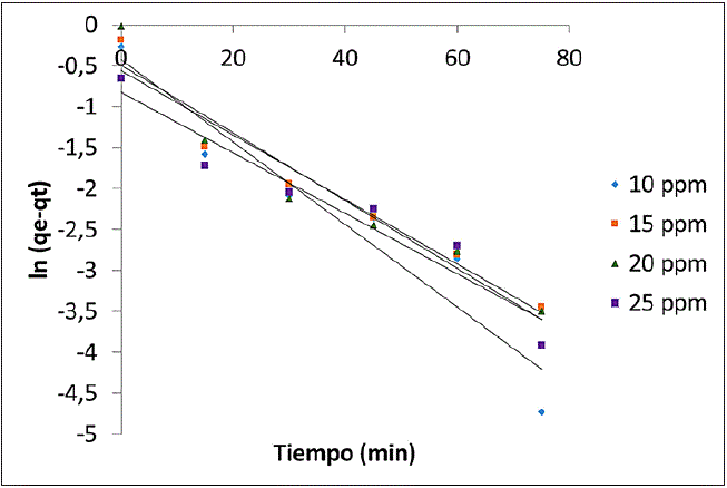 El modelo de seudoprimer orden supone que la velocidad de adsorción con respecto al tiempo es proporcional a la diferencia entre la capacidad de adsorción en el equilibrio (qe) y la cantidad adsorbida en un tiempo determinado (qt) [11], tal como se muestra en la ecuación 2.