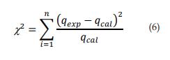 Se utilizó la distribución Chi cuadrado (ecuación 6) como una función de error para validar el modelo cinético. Un menor valor de este análisis de error indicará un mejor ajuste de la curva [16]methylene blue (MB. Las variables qexp y qcal son las cantidades de adsorción en el equilibrio determinadas experimentalmente y calculadas por medio del modelo, respectivamente