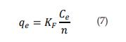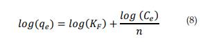 Donde KF es la constante de adsorción de Freundlich relativa a la capacidad de adsorción del adsorbente (l/g), qe la cantidad de adsorción en el equilibrio (mg/g), Ce es la concentración del adsorbato en el equilibrio (mg/l), y n es una constante adimensional que puede explicar la intensidad de adsorción del sistema. Los valores de KF y n pueden calcularse del intercepto y la pendiente de la gráfica log(qe ) contra log(Ce )
