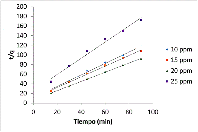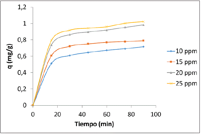 La adsorción del colorante depende de la relación entre su concentración y los sitios de enlace disponibles en la superficie del adsorbente. El estudio se realizó a 25±0,5 °C, a pH de 6 y una concentración de adsorbente de 6 g/L; se varió la concentración de naranja de metilo en cuatro niveles: 10, 15, 20 y 25 ppm. Se realizó una gráfica que presenta la cantidad de adsorción con respecto al tiempo para cada uno de los niveles deconcentración de adsorbato.