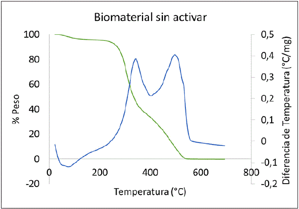 Se clasificó el residuo como: sin activar, activado y postratamiento. Los materiales se caracterizaron por análisis termogravimétrico (TGA), calorimetría diferencial de barrido (DSC) y área específica superficial (BET).