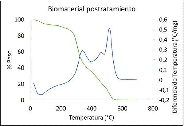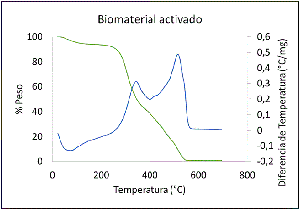 El estudio de tga revela dos etapas endotérmicas en la región entre 0 °c y 250°c, correspondientes a la pérdida de la humedad retenida en el material [17] thermogravimetric analysis (TGA, y de compuestos volátiles que componen el adsorbente, los cuales están representados a los 290 °C aproximadamente; dado que la primera señal en el adsorbente sin activar (Fig. 2) es superior al activado (Fig. 3), se puede concluir que la señal corresponde a la liberación de humedad contenida en el material. Dado lo anterior, se deduce que la temperatura de tratamiento no alcanza a retirar toda la humedad contenida en el material. En la región por encima de 300 °C se observan dos eventos exotérmicos para el adsorbente sin activar y el activado (figuras 2 y 3); estas señales corresponden a la descomposición final del material. En la Fig. 4 se observa la desorción exotérmica del biosorbato en aproximadamente 480 °C, lo que indica una fuerte afinidad del naranja de metilo a ser adsorbido en el material estudiado.