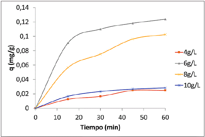 La dosis del adsorbente es un parámetro muy importante en un estudio de adsorción ya que determina la capacidad del adsorbente para tratar una solución coloreada de una concentración inicial dada. El estudio se realizó a 25±0,5 °C, una concentración de 20 ppm de naranja de metilo y a pH de 6; se varió la concentración del adsorbente en cuatro niveles de 4 a 10 g/L. Se analizó una gráfica que presenta la cantidad adsorbida con respecto al tiempo para cada uno de los niveles de dosificación de adsorbente.