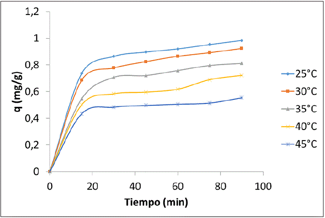 El efecto de la temperatura se evaluó a un pH de 6, una concentración de adsorbente de 6 g/L y una concentración de adsorbato de 20 ppm; se varió la temperatura en cinco niveles: 25, 30, 35, 40 y 45 °c. Se analizó una gráfica del porcentaje de adsorción con respecto al tiempo para cada uno de los niveles de temperatura.