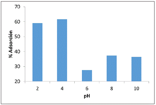 Para el sistema, a una temperatura de 25±0,5 °C, una concentración de adsorbente de 6 g/L y una concentración de naranja de metilo de 20 ppm, se varió el pH en cinco niveles: 2, 4, 6, 8 y 10. Se realizó una gráfica del grado de adsorción con respecto al tiempo para cada uno de los niveles de pH.