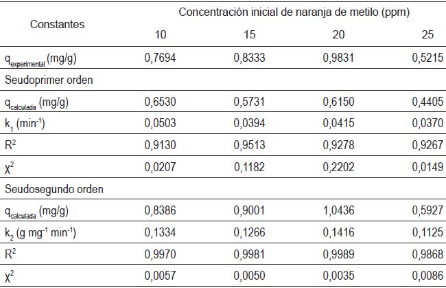 De acuerdo con las representaciones de las figuras 10 y 11, se puede inferir que el modelo de seudosegundo orden describe la cinética de adsorción del naranja de metilo sobre el adsorbente a base de café molido. Los parámetros calculados de los modelos cinéticos y los resultados de la validación con χ2 se encuentran reportados en la Tabla 1, en la cual se observa que, según los valores de R2 y de Χ2 para el seudosegundo orden, la suposición de que este modelo rige la cinética de adsorción es adecuada [18].